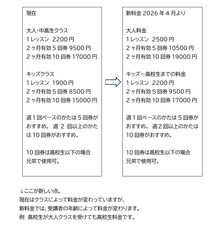 レッスン料金 ●入会金なし ●回数券の有効期限は、スタジオが休みのときと講師が休んだときは延長いたします。 ●以下のクラスは料金が異なります。■SALSA 50分クラス 1回 1500円 プライベートレッスンは60分2000円 2人以上は60分1人1500円 払い戻し規定 回数券の払い戻しは基本的にできません。 しかし、スタジオ側に非がある場合は払い戻しいたします。 (例) 講師が急に退職した場合。講師が長期休講した場合。 クラス内容の変更があった場合。 クラス時間の変更があった場合。