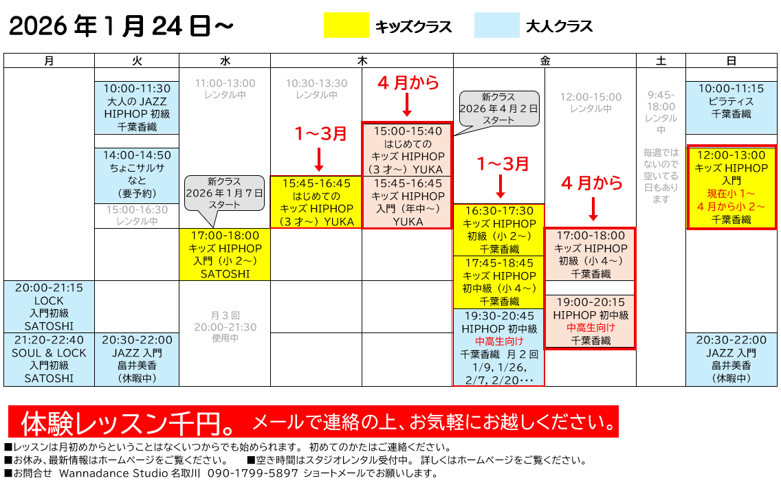 休講などお知らせ ●畠井美香先生 体調不良のため当分のあいだお休みします。 ●急ですがYuuka先生は退職されました。クラスはありません。 ●千葉香織先生 3/6(金)、3/8(日)お休み。 ●千葉香織先生 3月の中高生Hiphopは、3/13(金)と3/27(金)です。 タイムテーブル